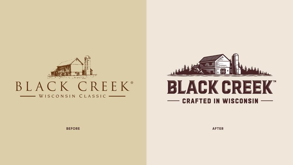 “We reimagined the brandmark to enhance legibility and impact, and introduced a new handcrafted illustration of the barn, creek, and forest landscape, bringing Black Creek’s story to life, visually expressing our Wisconsin heritage.” says Kossar.