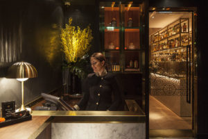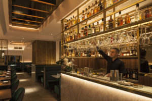 On entering Indian Accent, guests are greeted in a warm and atmospheric lobby, which provides a glimpse into the main restaurant area through opulently decorated glass doors. The space is adorned with natural stone flooring, dark grey polished plaster walls and walnut joinery framed with a thin brass edging. The dominant feature is the traditional liquor display cabinet showcasing a vast array of the world’s finest whiskeys.