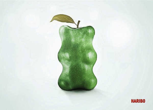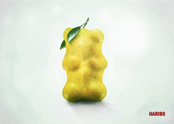 German confectioner Haribo has launched a print ad campaign that features images of juicy fruits that have been digitally manipulated into the shape of the gummy bear.