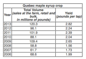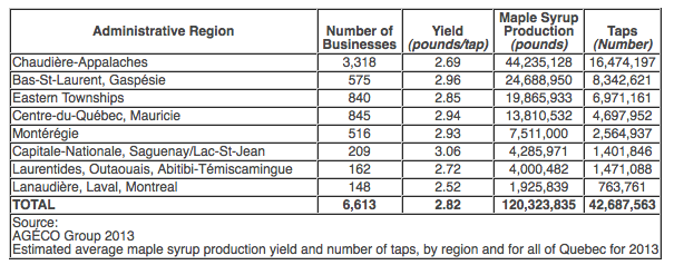 “As such, the maple producers in the far east of Quebec, specifically in Bas-Saint-Laurent, had yields as high as those of their fellow producers to the west, in Montérégie (2.96 lb./tap and 2.93 lb./tap respectively).”