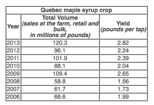 The 42.7 million taps operated by the 7,300 maple syrup producers in Quebec have produced 120.3 million pounds of syrup, an all-time high, with an average of 2.82 pounds per tap. It would be fair to call it an excellent harvest. The previous record was from 2009, when production hit 109 million pounds and average production per tap was 2.65 pounds.