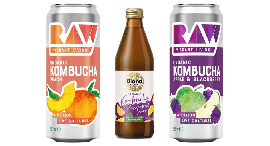 Biona Passion Fruit & Lemon Kombucha and RAW Vibrant Living Peach and Apple & Blackberry Kombuchas are available now from Biona.co.uk.