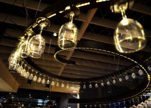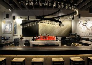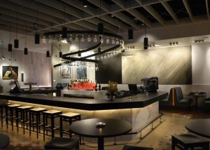 Although the original Hal’s did not have space for a central island bar, the luxury of a larger site meant that the new Hal’s bar is a compelling focal point, with its iconoclastic marble front and concrete top with a unique copper inlay detail, illuminated by a bespoke spiralled wineglass chandelier that draws in passers-by through the fully retractable glass front façade.